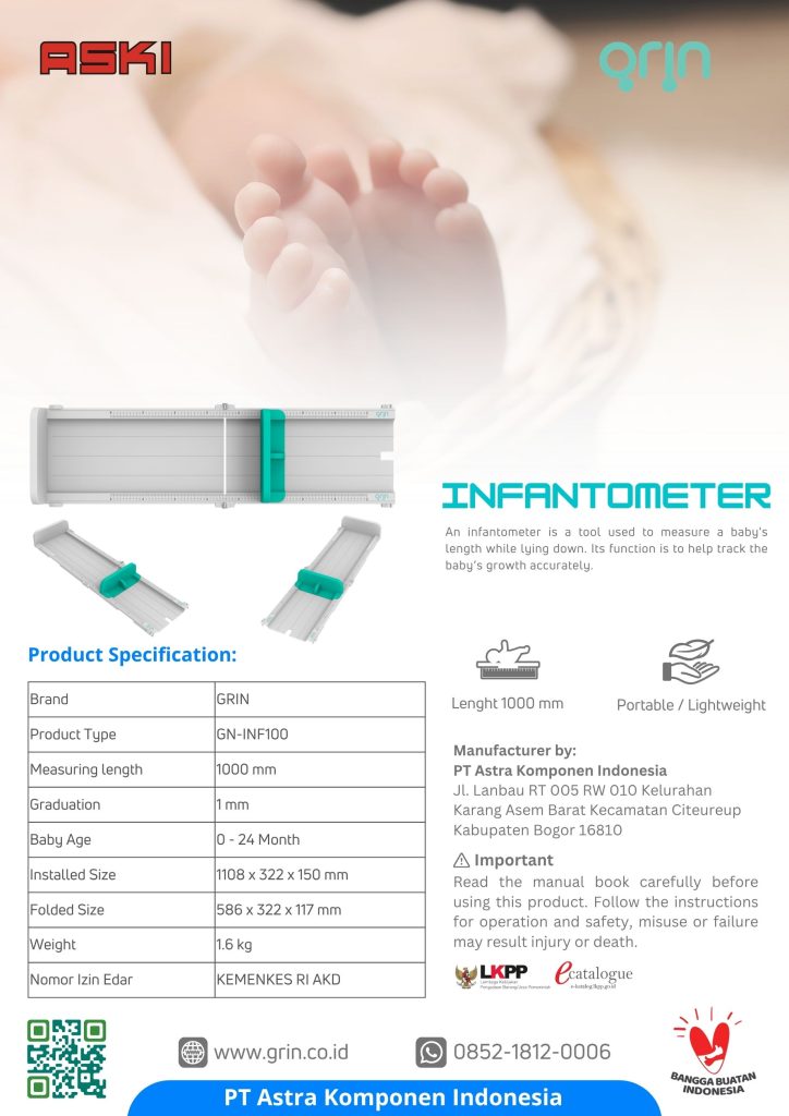 Infantometer Deskripsi Singkat ProdukInfantometer is a medical equipment that measures the size of baby as part of monitoring an infant’s growth. Spesifikasi ProdukHigh range: 0 – 100 cmMinimal graduating 0,1 cmAccuracy 0,1 cmMaterial: Best quality ABSWeight 1,6 kg Link Pembelian