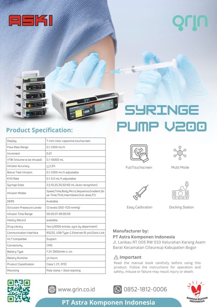 The Syringe Pump V200 is a high-precision medical device designed to deliver small volumes of fluids or medications accurately and consistently through a syringe. It features an easy-to-read digital display, adjustable infusion rates, and built-in safety systems such as alarms for occlusion and flow errors. With its compact, user-friendly design, the device is well-suited for use in various clinical settings, including ICU, NICU, and general patient care units.